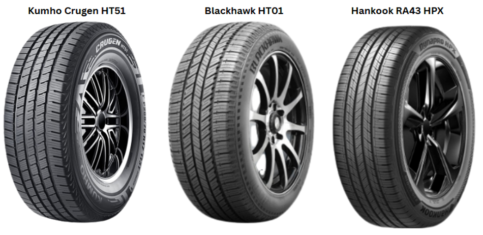 Highway/Urban SUVs – Kumho Crugen HT51, Blackhawk HT01, Hankook RA43 HPX, great for SUV tyres that see mostly road use but still want decent grip on gravel: