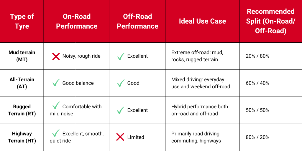 4×4 all-terrain tyres provide a balance between off-road capability and on-road comfort. Normally, manufacturers recommend a split of 60% on-road and 40% off-road use.